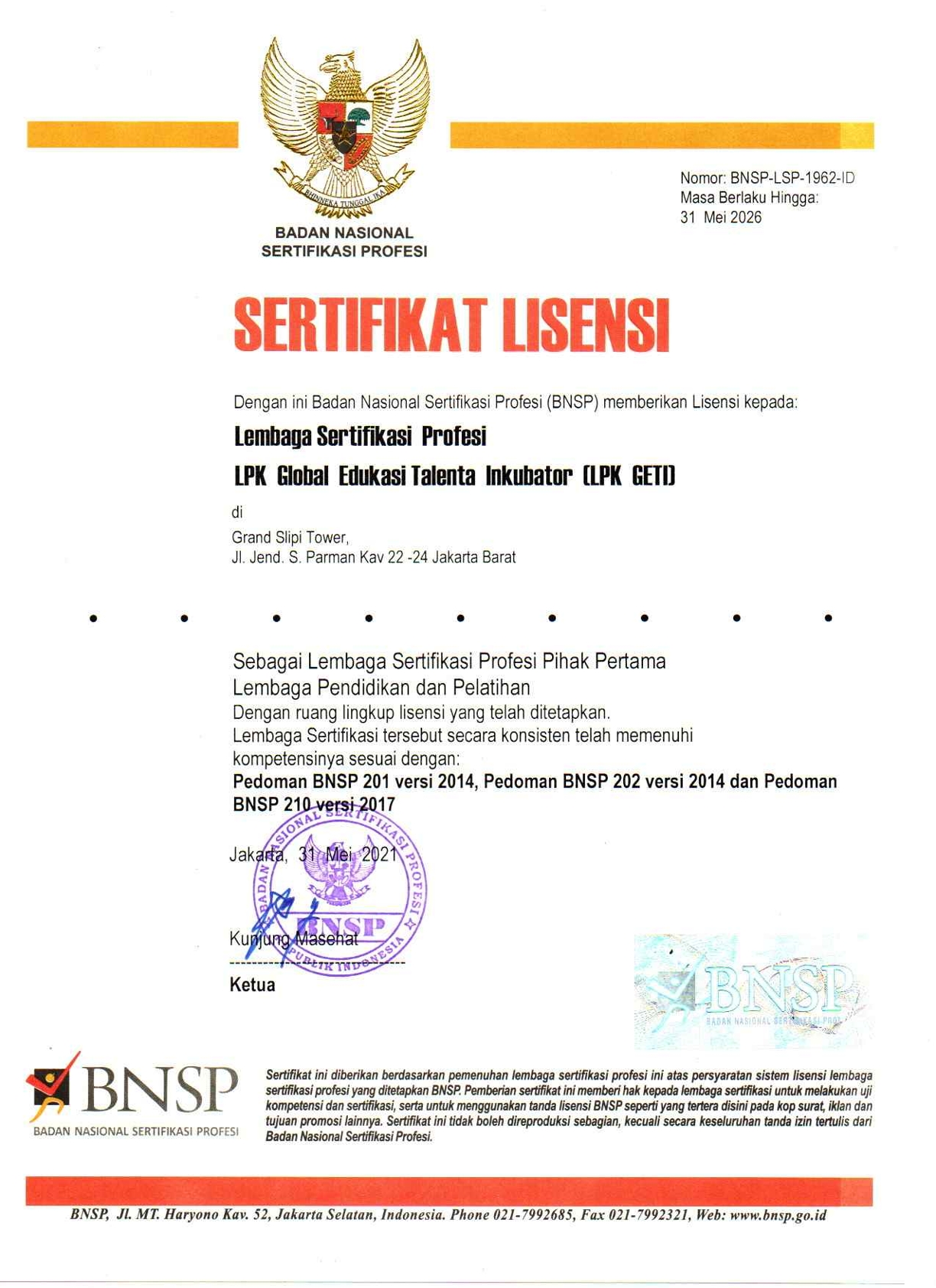 Lembaga Sertifikasi Profesi P1 LPK GETI atau disingkat LSP-P1 LPK GETI memperoleh lisensi dari Badan Nasional Sertifikasi Profesi (BNSP) untuk melaksanakan proses sertifikasi kompetensi sesuai ruang lingkup skema yang ditetapkan. Sebagai LSP Pihak Pertama yang dibentuk oleh LPK GETI, LSP-P1 LPK GETI memiliki peran strategis dalam memastikan mutu dan standar kompetensi lulusan serta tenaga kerja yang disertifikasi.