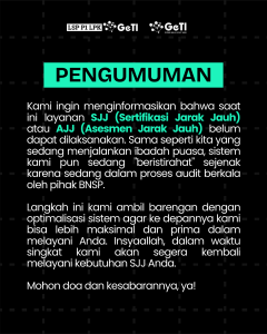 LSP P1 LPK GeTI menyampaikan bahwa untuk sementara waktu layanan SJJ (Sertifikasi Jarak Jauh) atau AJJ (Asesmen Jarak Jauh) belum dapat dilaksanakan.